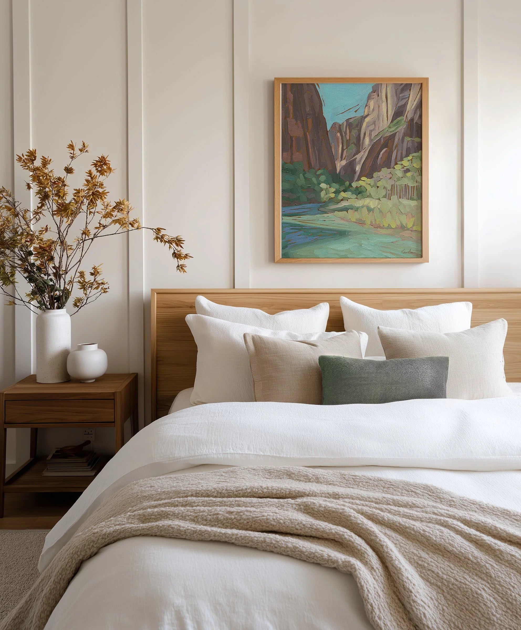 You can choose to add a white oak floating frame to beautifully elevate your canvas print. Frames are made in the U.S. and are solid white oak.